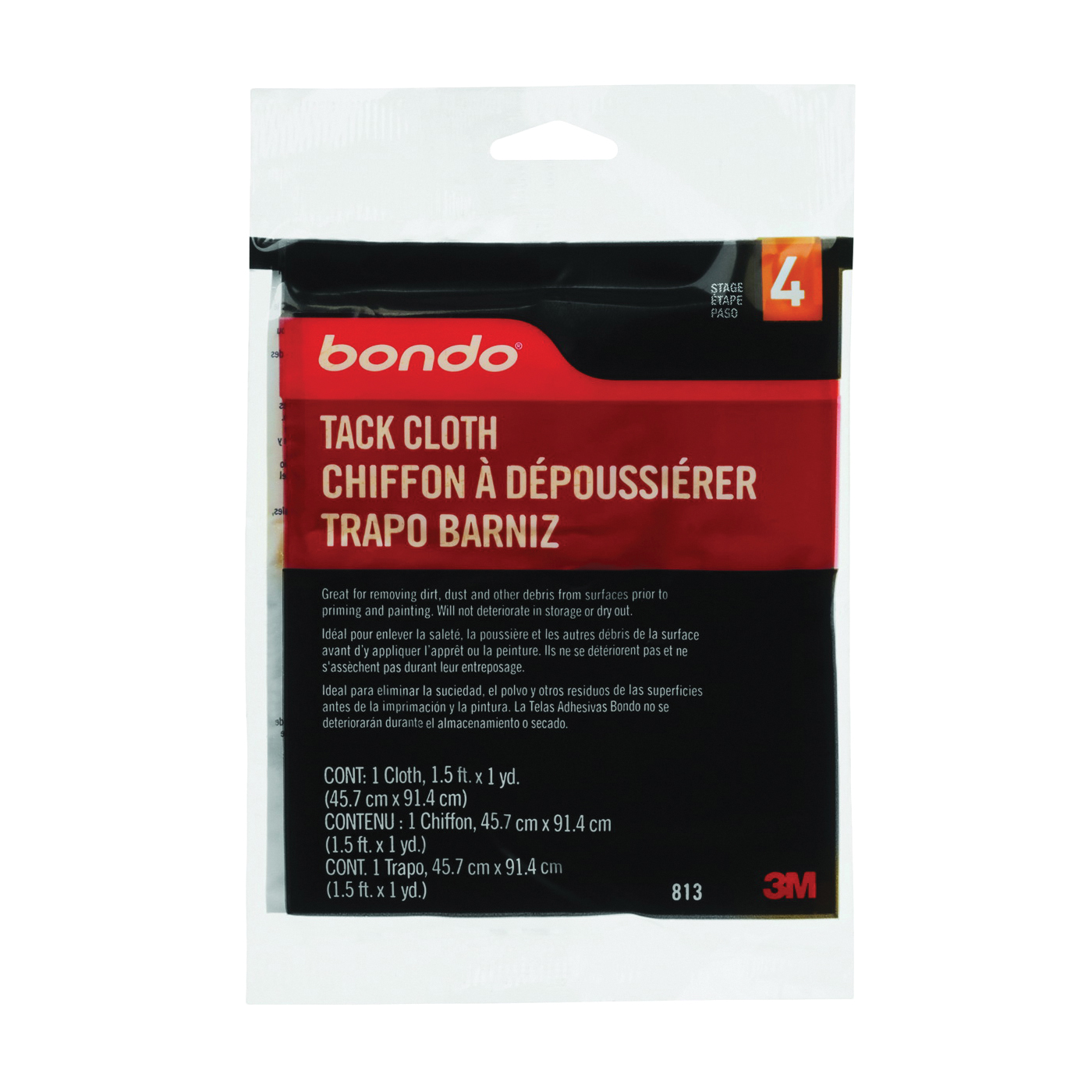 Bondo® tack cloth helps to remove loose sand dust and trash particles from surfaces before priming and paint application. A light tack on the smooth cloth surface lets technicians remove dust, lint and dirt with only a light application. Our cloth gives you a clean surface that will enhance the quality of the paint job.