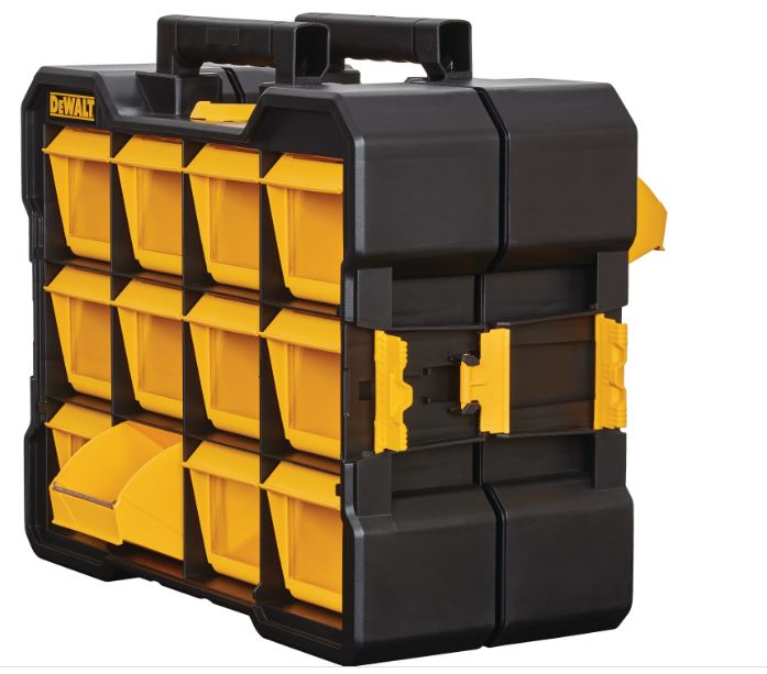 This unique organizer has 12 removable bins that can either be individually opened from within the organizer unit or be taken out for full accessibility on the jobsite. A lock on top securely holds all of the bins in place and allows items to be safely transported. This organizer can be stacked with other organizers from the PRO line or with another similar unit for optimal access to all your small parts and accessories.