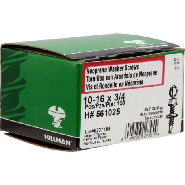 Hillman 561025 Screw, #10-16 Thread, 3/4 in L, Washer Head, Hex Drive, Self-Drilling Point, Steel, Zinc-Plated, 100 PK
