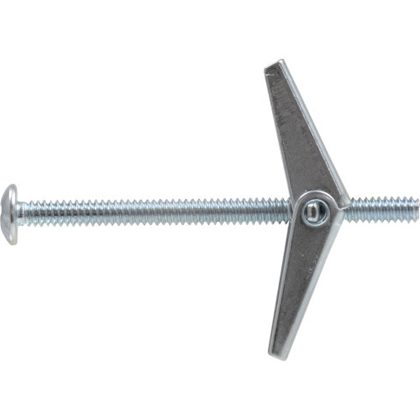 Toggle bolts come with spring-action wings and are intended for anchoring into hollow walls. The wing is designed to spread apart behind the base material upon installation for firm hold in hollow wall applications. The wing disperses the weight of the secured item over a larger area, increasing the weight that can be secured compared to a regular bolt.