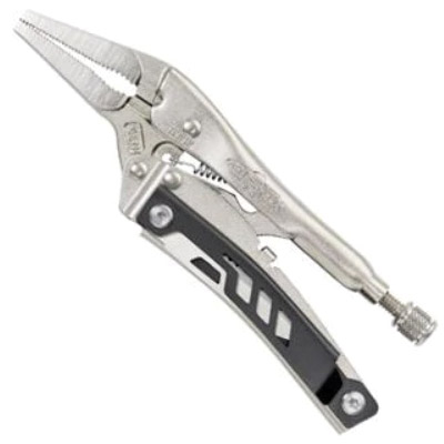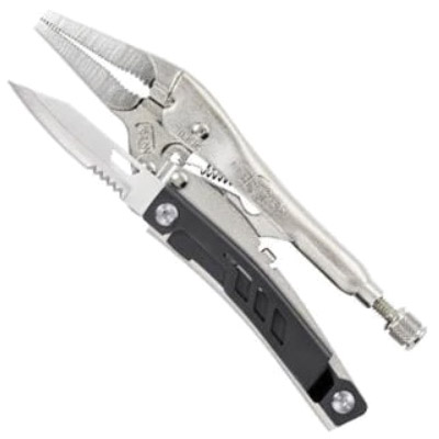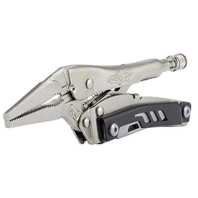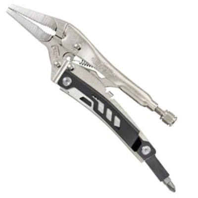 The new Irwin Vise-Grip® 6 in long nose locking multi-pliers feature the legendary locking pliers performance tradesmen have trusted since 1924. The 6LN locking multi-pliers feature a fold-out stainless steel serrated knife blade and a fold-out stainless steel serrated knife bland and a fold-out screwdriver including a 1/4 in bit holder with 6 row #8 slotted and #2 Phillips® bits. The four-tools-in-one design allows users to carry fewer tools on the job.