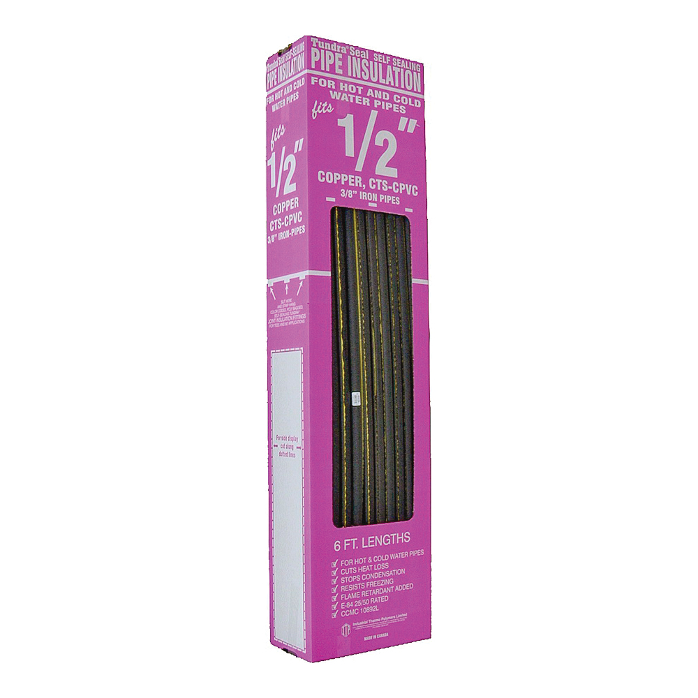 Tundra brand polyethylene pipe insulation is a flexible and easy-to-apply tubing product available in semi-slit and self-sealing styles. It is packaged in cartons that feature the copper tube sizes in bold color-coded print. The self-sealing version has yellow self-seal release liner that is both easy-to see and peel. Tundra brand polyethylene pipe insulation is sold in all the common sizes required for home plumbing systems, including special fittings for tees and 90 deg elbows. This chemically inert pipe insulation has a closed cell structure that allows it to function as an efficient insulator.