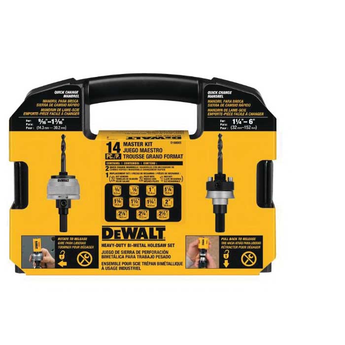 This heavy-duty, 14-piece master kit includes 11 bi-metal hole saws, a small and large quick-change mandrel with a replacement parts set. The items come in a durable case and helps keep all items organized.
