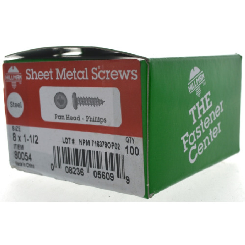 Hillman 80054 Screw, #8 Thread, 1-1/2 in L, Pan Head, Phillips Drive, Sharp Point, Steel, Zinc-Plated, 100 PK