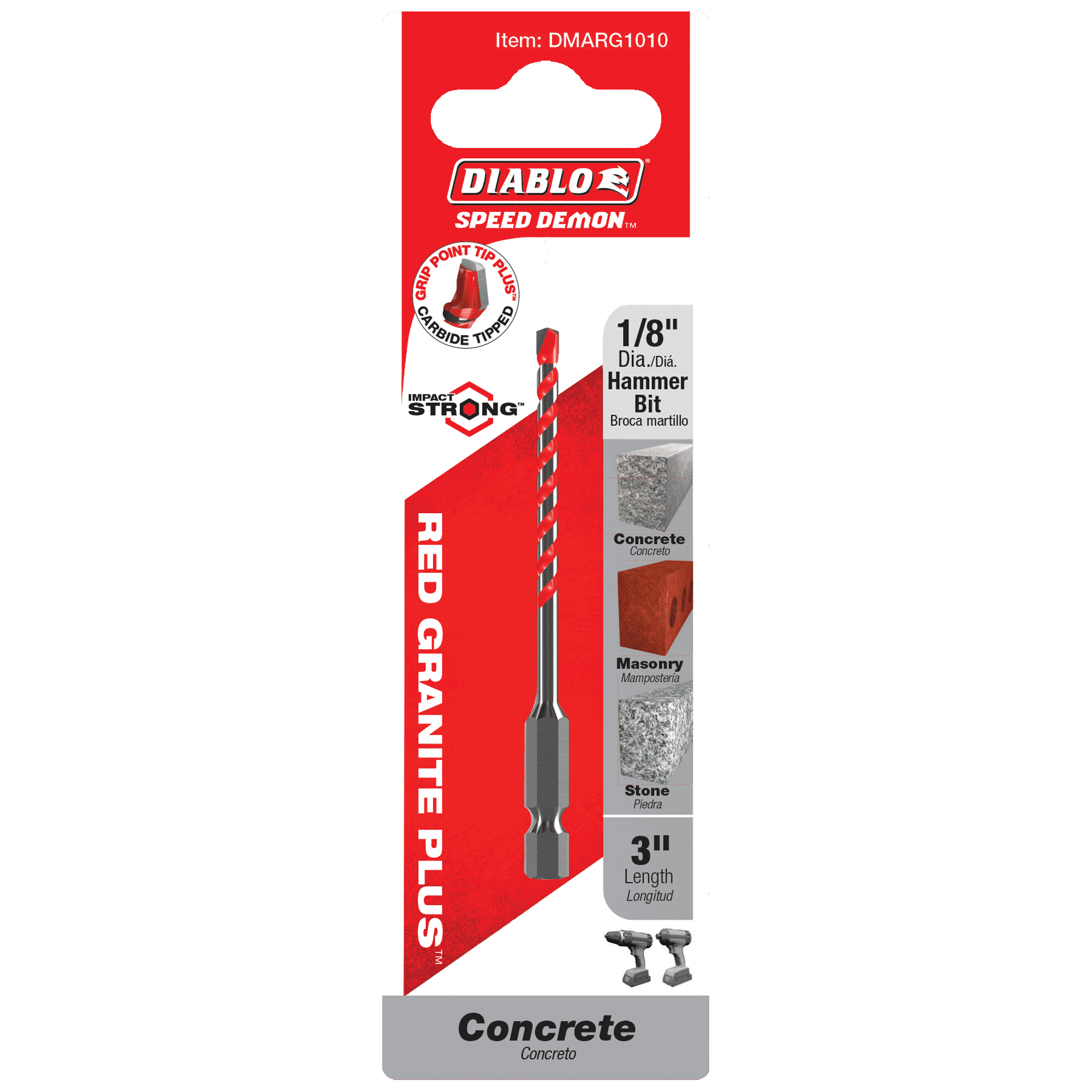 Diablo SPEEDemon DMARG1010 Hammer Drill Bit, 1/8 in Dia, 3 in OAL, Percussion, U-Flute Flute, 10 mm Dia Shank, Hex Shank