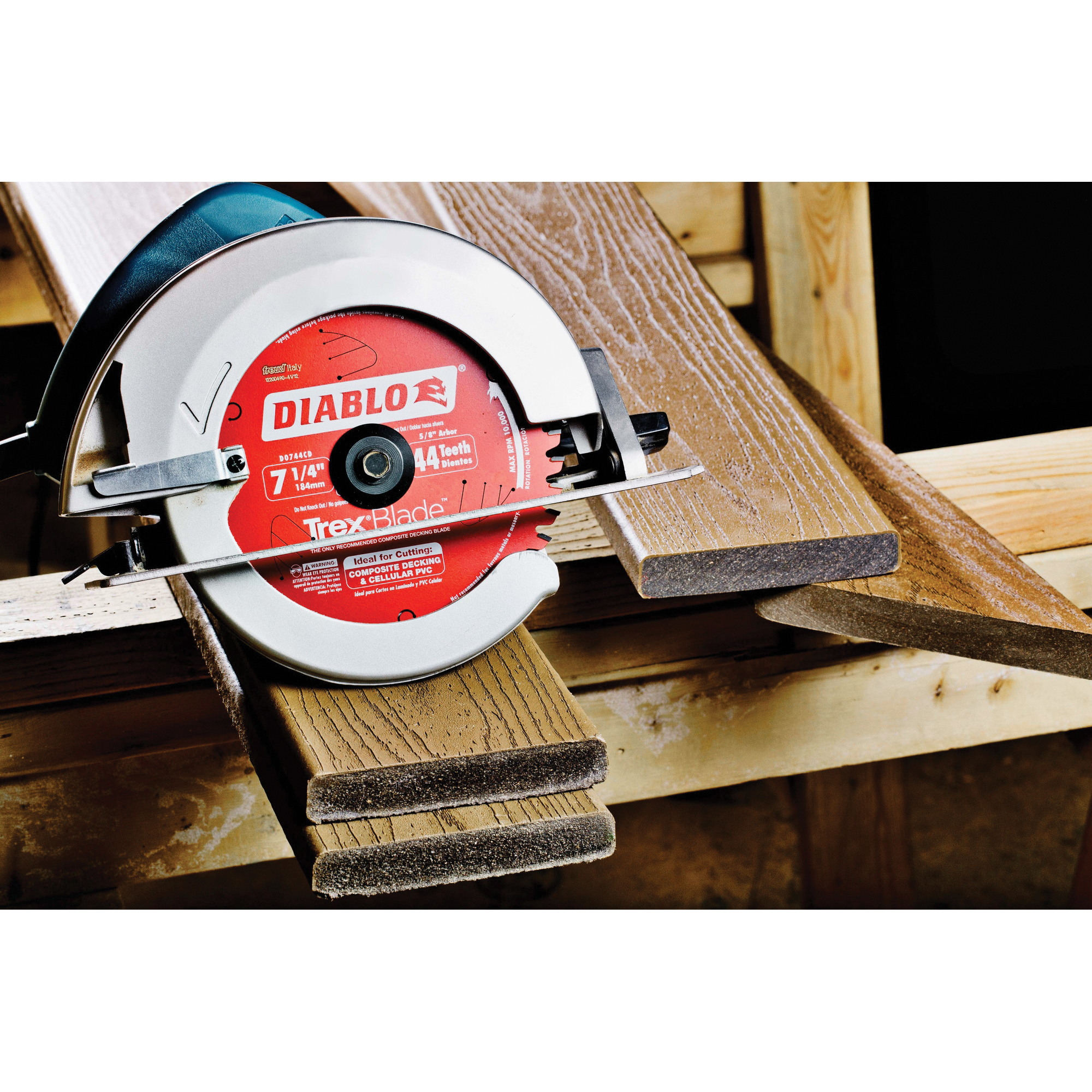 Diablo's TrexBlade™ saw blade for composites and plastic is the only blade recommended by Trex company for cutting their composite decking materials. These new blades deliver maximum performance and highest quality of finish; making it a 'must-have' tool for both professionals and DIYers planning composite decking projects. Diablo's new saw blade series has a modified triple chip tooth grind design, Perma-Shield® non-stick coating and specific TiCo™ hi-density carbide to deliver more efficient and cleaner cuts with no swirl marks, less "gumming" of blade teeth and longer cutting life .