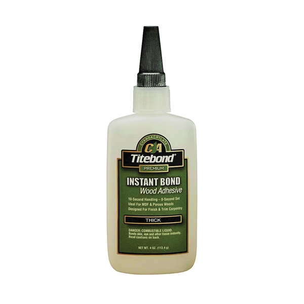 Titebond instant bond is a two-part bonding system that takes between 5 to 15 sec to set and 30 to 60 sec for initial cure. It provides a strong, permanent bond and is ideal for hard to reach joints or surface areas that are difficult to clamp. Designed primarily for wood and wood products, this adhesive is also very effective on a wide variety of materials and substrates. Titebond instant bond thick viscosity product offers an assembly time of 10 sec and an initial cure speed of 8 sec. It is ideal for bonding end-grain in a miter joint application, quick assembly of jigs and fixtures, adhering turning blocks to scrap blocks on a faceplate for immediate use.