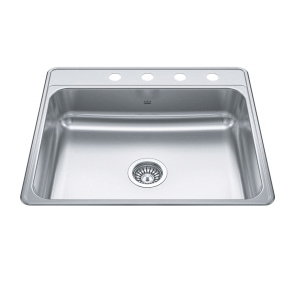 Kindred Sink, Number of Bowls: 1, Number of Faucet Holes: 4, 22 ga Thick, Bowl Width: 23 in, Bowl Depth: 6 in, Bowl Height: 17 in, 25 in OAW, 22 in OAH, Stainless Steel, Satin, Drop-In Mounting