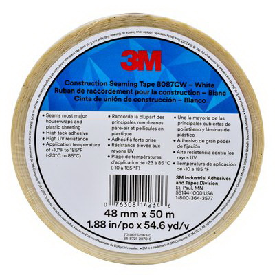 3M Construction seaming tape 8087CW is a cold-weather sheathing tape designed to seal seams on housewrap and exterior sheathing materials. This tape features an aggressive pressure sensitive acrylic adhesive mounted on a biaxially oriented polypropylene film. It performs exceptionally well in cold temperature applications.