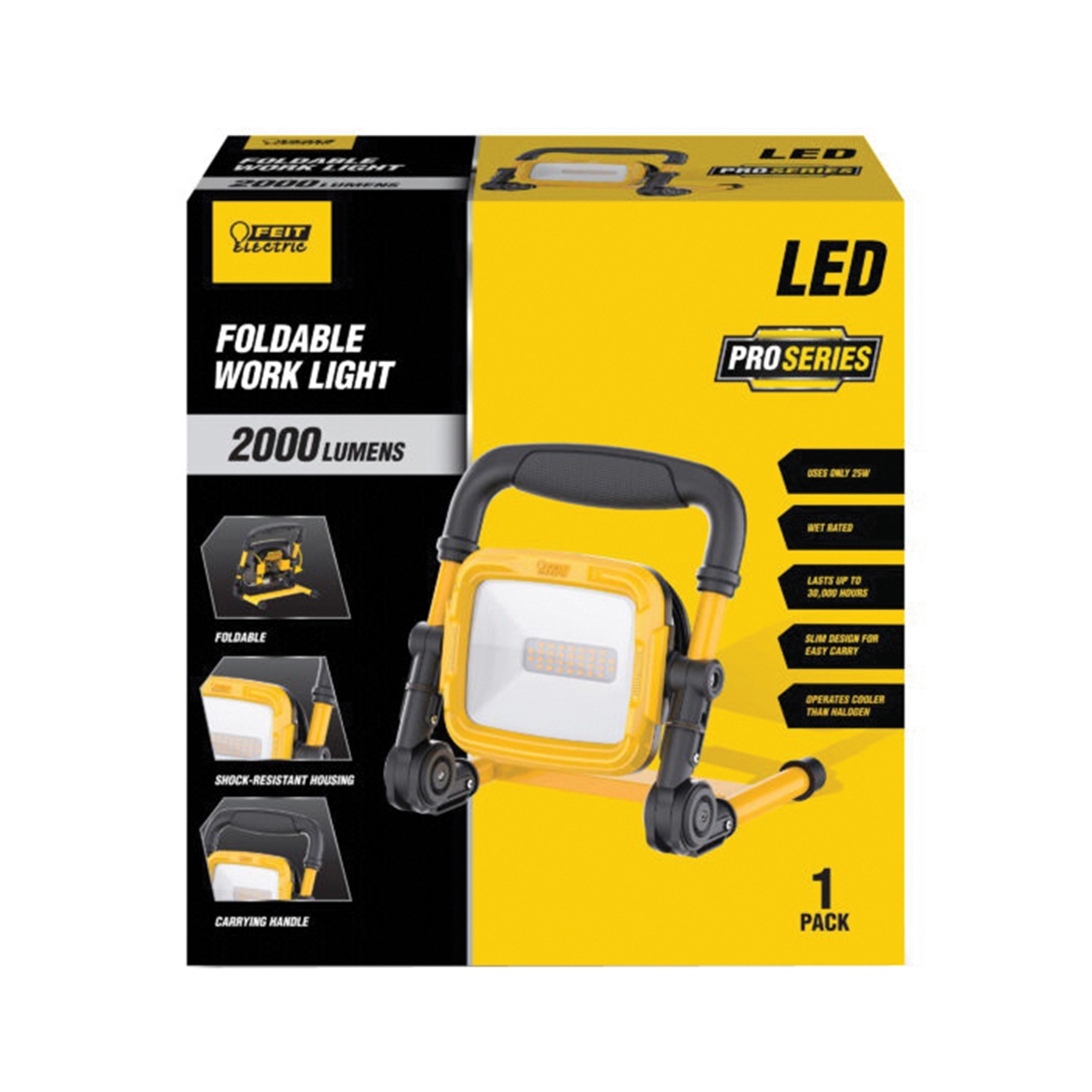 Light up the worksite with the Feit Electric WORK2000XLPLUGFOLD portable plug-in LED work light. This unit is water and dust-resistant, with cast metal housing and a heavy-duty 18/3 power cord. Integrated LED lights output up to 2000 Lumens of 5000 K daylight color temperature light and last 30,000 hr on average. A foldable design allows users to angle the light exactly where needed. Choose a Feit Electric work light for your portable lighting needs.
