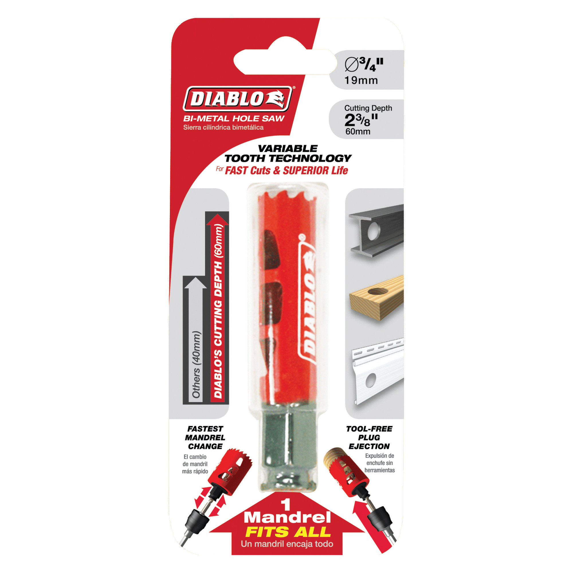 Diablo's new, high-performance hole saws deliver faster cutting performance and increased productivity. Unlike anything on the market, Diablo's hole saw system and mandrel design simplify the attachment process for fast and efficient hole saw-mounting. These radical new hole saws provide ultimate cutting length to bore deeper holes in a single pass, tool-free plug ejection and variable tooth design for faster cuts.
