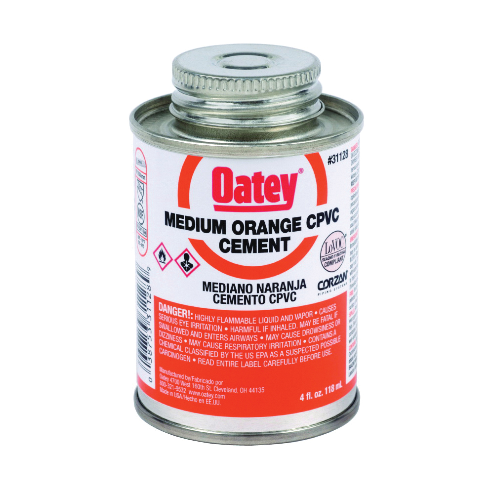 Oatey® CPVC medium bodied fast set orange cement is recommended for cold water systems and hot water systems up to 200 deg F/93 deg C. It is approved for Corzan® CPVC piping systems. Its medium body has excellent gap filling properties and is easy-to-apply with included in lid dauber. This orange, low VOC, fast set cement can be used to solvent weld all schedules and classes of CPVC pipe and fittings up to 6 in. Diameter with interference fit. Oatey® products have earned the trust of plumbing professionals for over 100 years.