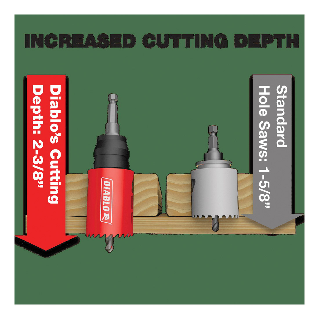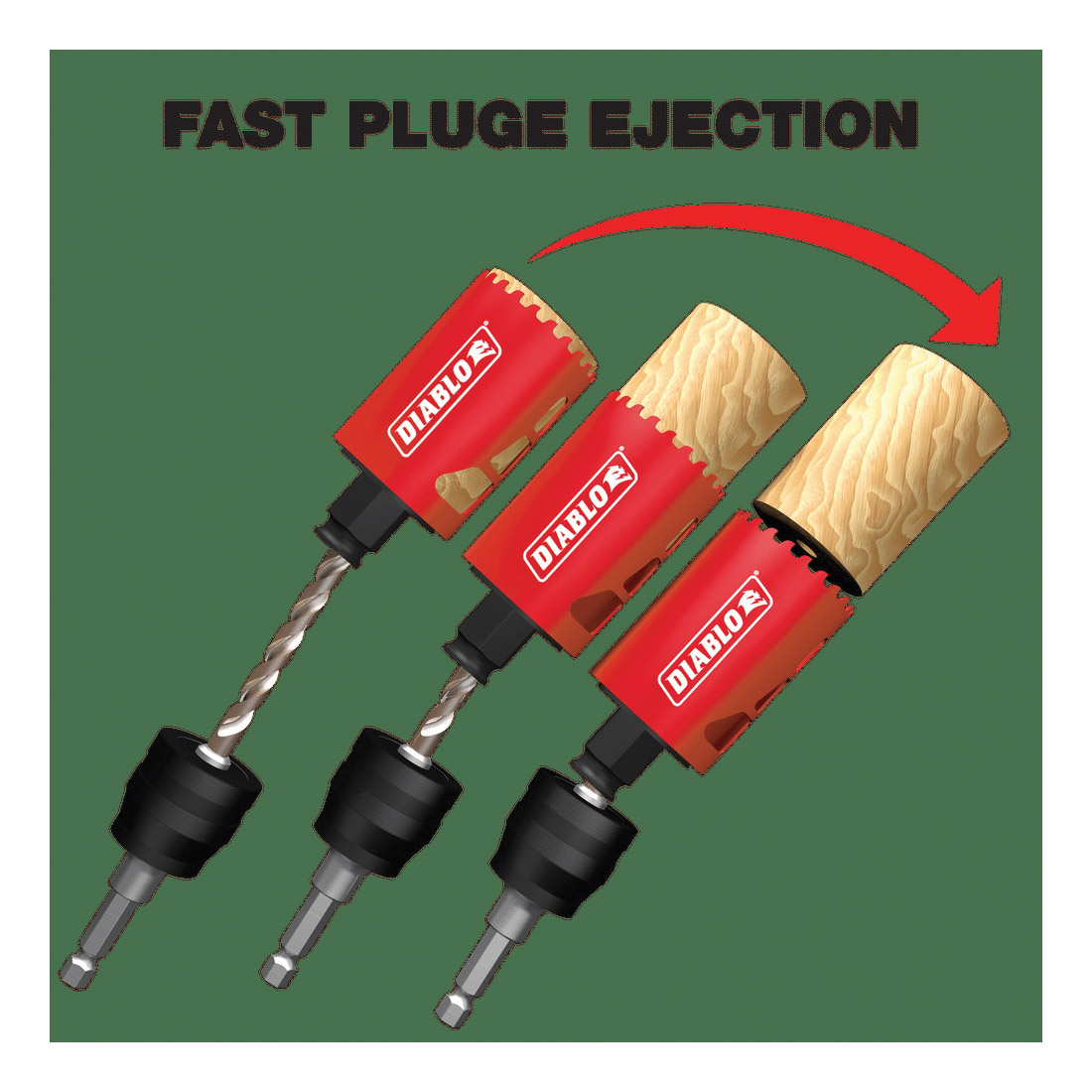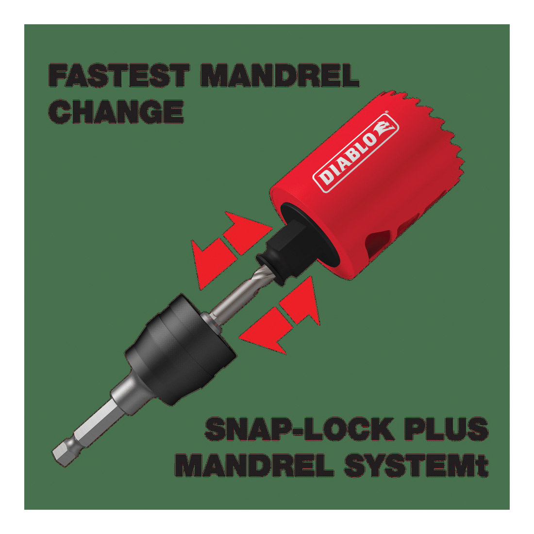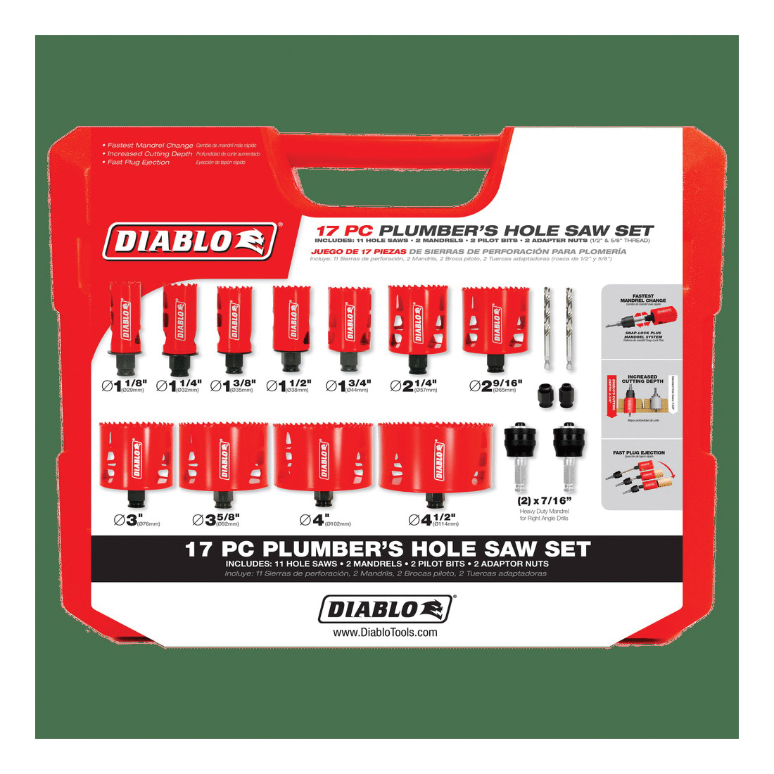 The Diablo 17-piece hole saw kit features five (11) bi-metal hole saw cups, two snap lock plus mandrels, two pilot bits and two adapter nuts (1/2 and 5/8 in) for quick and easy hole saw cup changes for maximum job performance. This new, high performance hole saw set delivers faster cutting performance and increased productivity versus standard bi-metal hole saws. Unlike anything on the market, Diablo's hole saws and snapLock plus mandrel system simplify the attachment process for fast and efficient hole saw mounting.