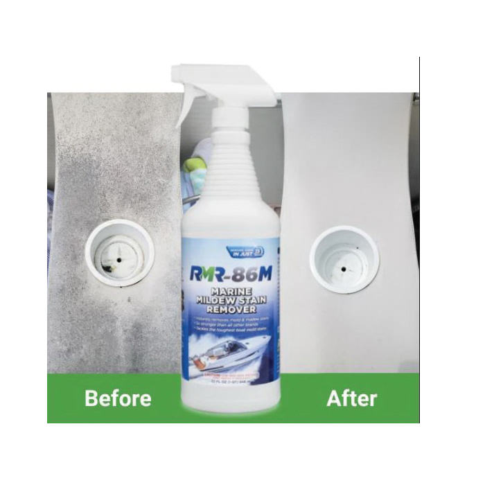 RMR-86M marine mildew stain remover instantly removes mildew stains on vinyl, vinyl covers, cushions and other marine surfaces. Designed to quickly eliminate mildew stains, RMR-86M mildew stain remover comes in an easy-to-use 32 oz spray applicator bottle, to efficiently target stains. For larger mold and mildew stain removal projects, we also carry a 1 gal refill. RMR-86M marine mildew stain remover contains a sodium hypochlorite formula that quickly removes mildew stains from vinyl seat cushions, vinyl covers, vinyl dashboards, fiberglass and other marine surfaces. RMR-86M is the fastest, easiest way to eliminate stains. Follow up with RMR-M botanical for long-lasting protection and to help keep surfaces looking cleaner and newer longer.