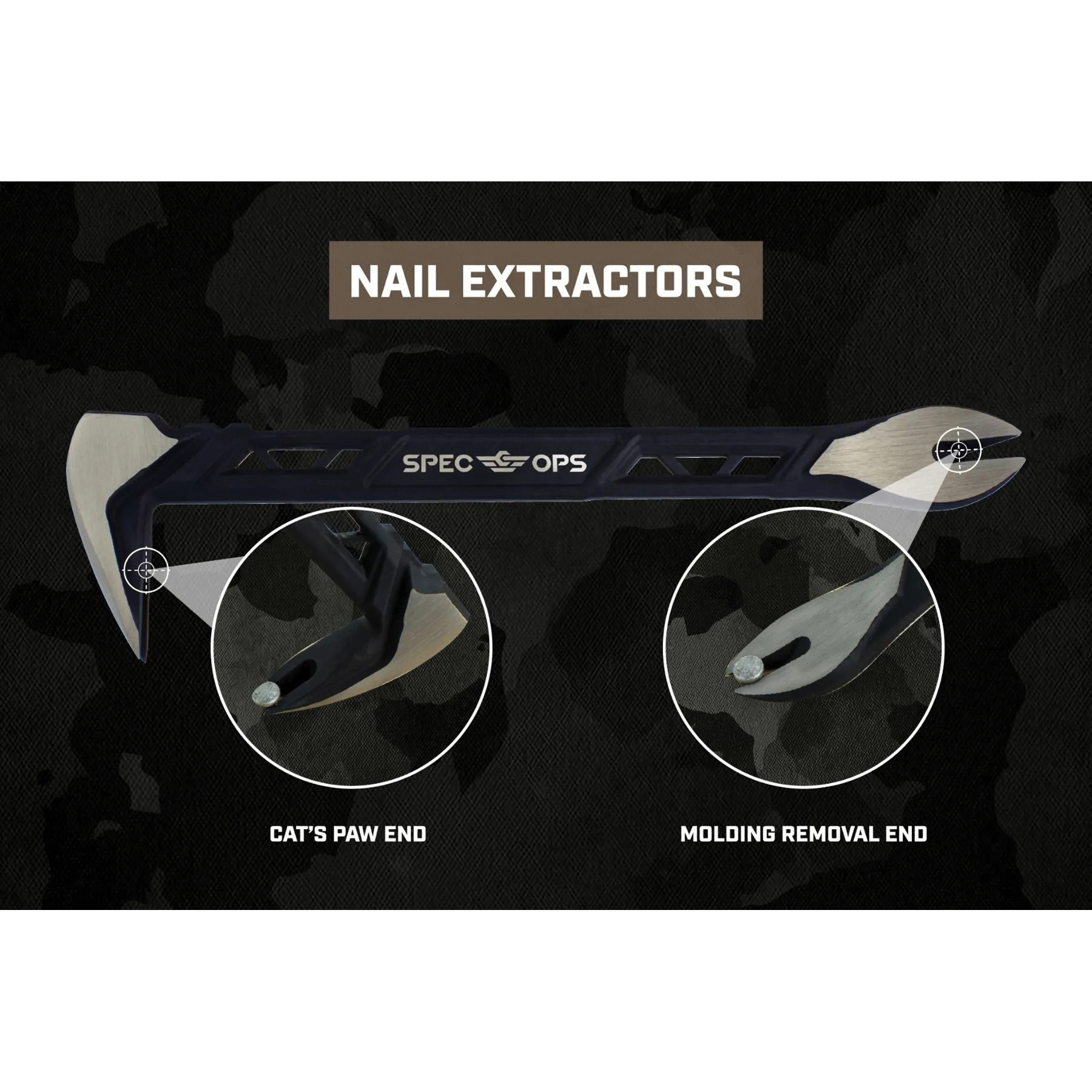 Manufactured with an up to 20% lighter advanced skeleton design, this nail puller is better used for removing small nails, embedded nails and headless nails with the two nail pullers and precision-honed claws, which allows for extreme versatility and minimal damage. The 20% lighter-yet-durable carbon steel of this tool gives credit to the comfortability of its grip, allowing for precise pulling of sharp nails with the sniper control design. The dual strike zones are designed for accurate and rapid nail extraction on any job site. And with a assurance to deliver a lifetime of mission capability on the world's toughest job sites, this nail puller has been drop-tested at 100 ft to surpass MIL-SPEC standards. All Spec Ops tools are backed by our five-star, hassle-free lifetime warranty and with each purchase made, we support our nation's heroes by donating 3% of proceeds to veteran and first responder causes.