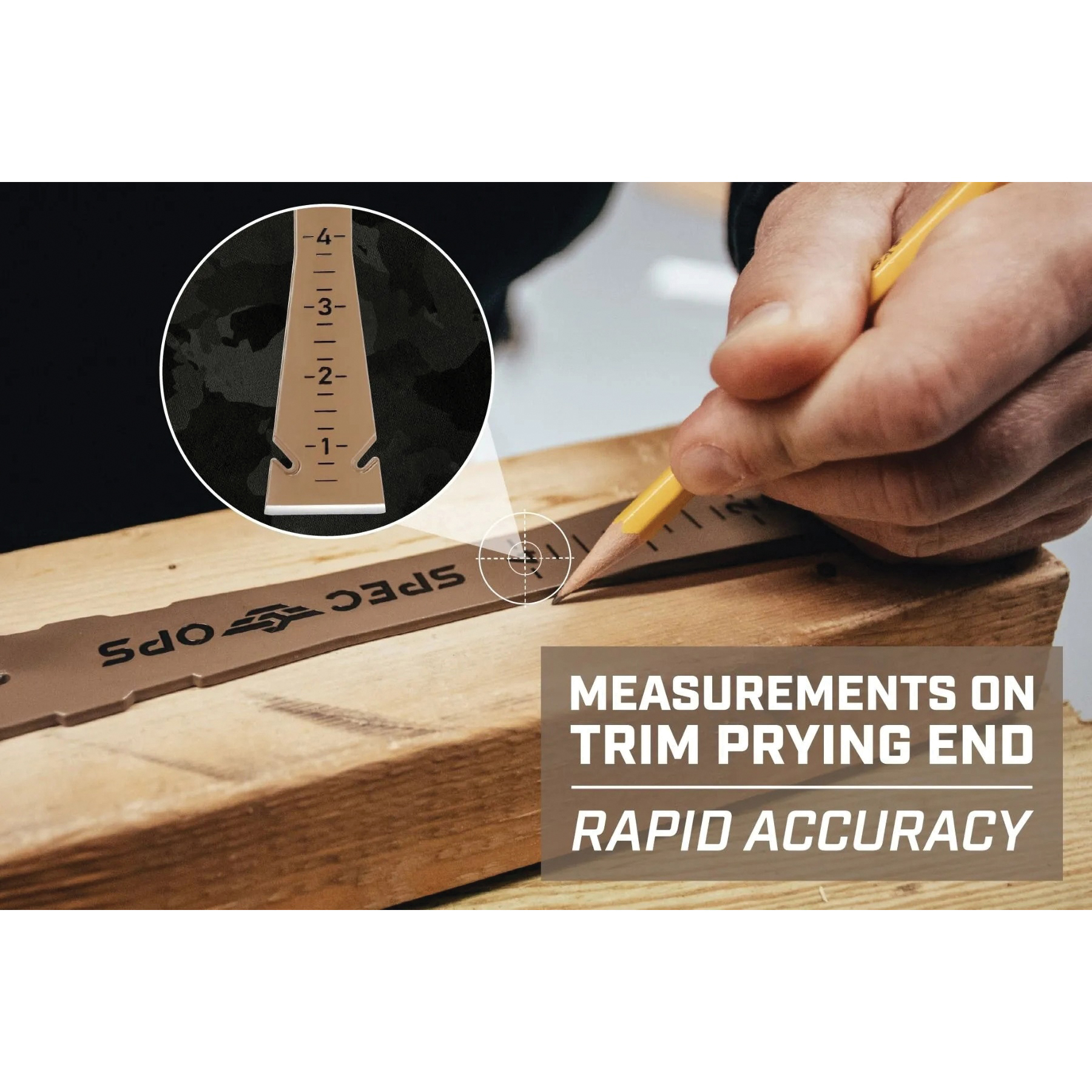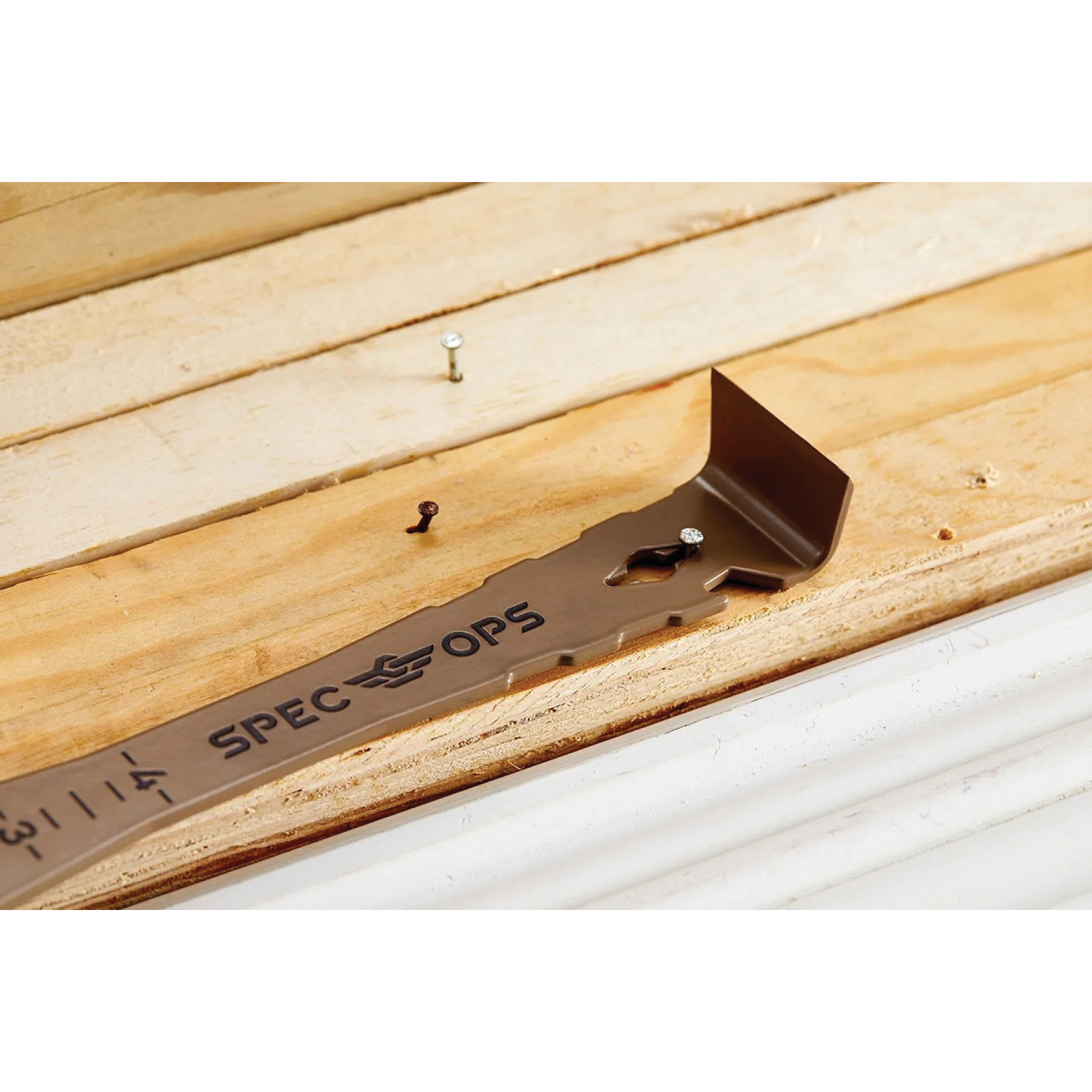 The Spec Ops Tools 9-1/2 in trim bar is the ideal addition to any professional's pry bar selection. This pry bar is constructed from rugged and durable high-carbon spring steel to mitigate any bending or snapping while in use, ensuring that this elite bar is made to last. Unlike other pry bars or scraper bars in the market, we've added a small, 4 in ruler for fast and accurate measurements when working on a job site. Exceeding expectations on any mission, the sharp beveled edges are critical for applications such as trim/moulding removal, scraping, demo work and prying. The 90 deg strike surface end with sharp edge is ideally used for siding nail removal or prying between finish work. For additional functionality, this trim bar comes with a nail puller, nail pulling slots for shingles and an onboard bottle opener. This bar has been drop-tested at 100 ft to surpass MIL-SPEC standards. All Spec Ops tools are backed by our five-star, hassle-free lifetime warranty and with each purchase made, we support our nation's heroes by donating 3% of proceeds to veteran and first responder causes.