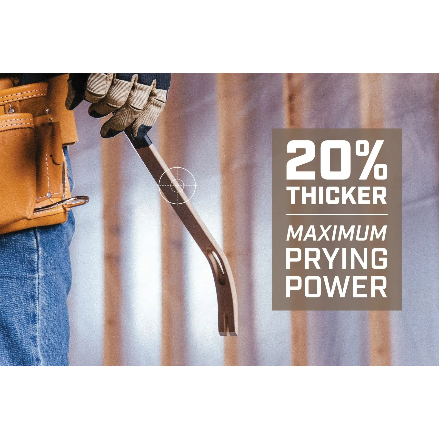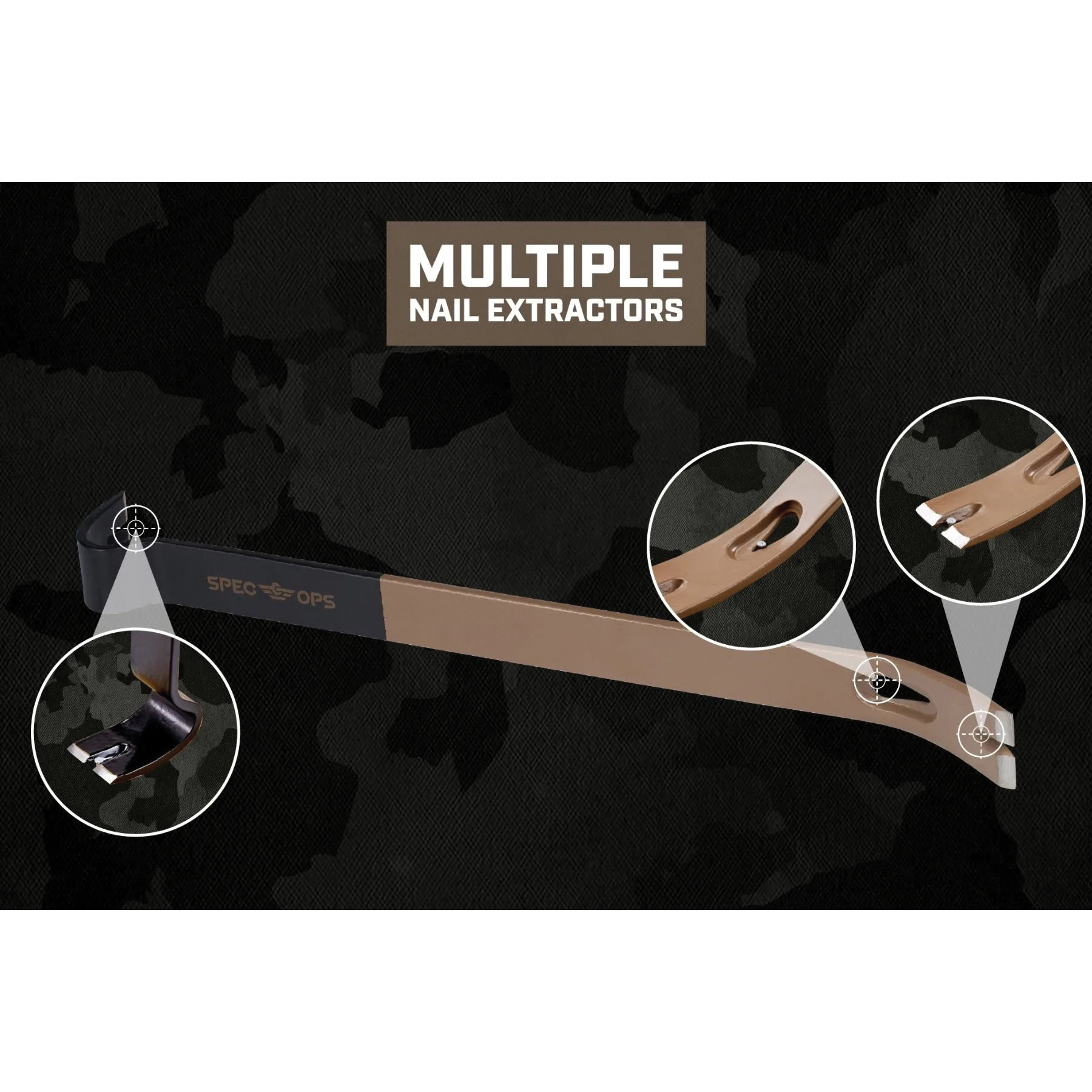 20% thicker for maximum prying power and destruction, this 21 in flat bar is known as one of the most useful demolition tools that's ideal for framers and roofers removing nails, clapboard siding or plywood or for general demo work. This bar is made to be extremely versatile and durable with multiple nail pullers for improved leverage. The curved rocker end is designed for sniper control when prying the most stubborn of nail heads. The broad, precision-honed beveled ends assist on any job site by allowing for easier penetration with minimal damage. This long, flat crowbar is constructed with high-carbon, spring tempered steel for maximum durability. And with a assurance to deliver a lifetime of mission capability on the world's toughest job sites, this pry bar has been drop-tested at 100 ft to surpass MIL-SPEC standards. All Spec Ops tools are backed by our five-star, hassle-free lifetime warranty and with each purchase made, we support our nation's heroes by donating 3% of proceeds to veteran and first responder causes.