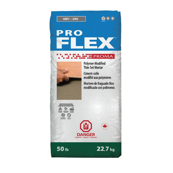 PRO FLEX® is an excellent mid-grade, single-component, polymer-modified thin-set mortar suitable for interior and exterior installation of institutional, commercial and residential non-vitreous, semi-vitreous, vitreous and impervious tiles including porcelain and most natural stone. Also suitable for the installation of most marble and granite tiles over well-prepared concrete and exterior grade plywood substrates.