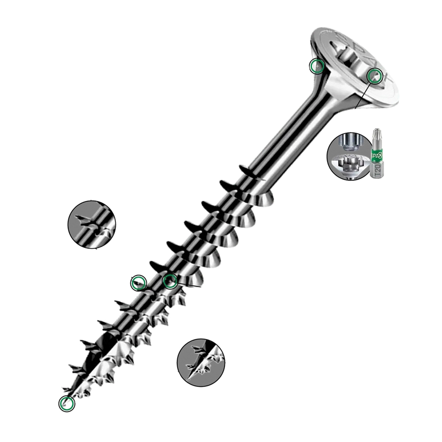 SPAX® T-star plus flat head fasteners with HCR-X™ coating are designed for use in multiple material connections often found outside residential domains. These "work horse" construction fasteners are designed to countersink in treated lumber for a clean flush finish and provides a quick and easy installation. In addition, they provide long-lasting, "contractor proven" secure connections.