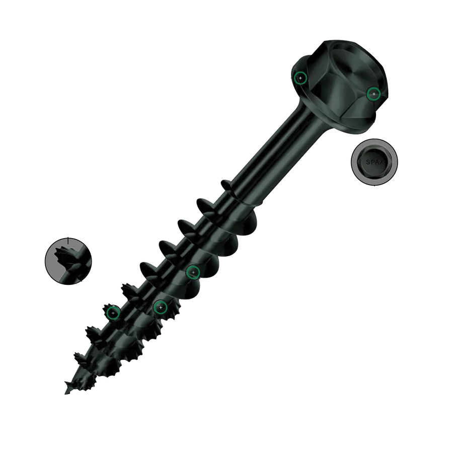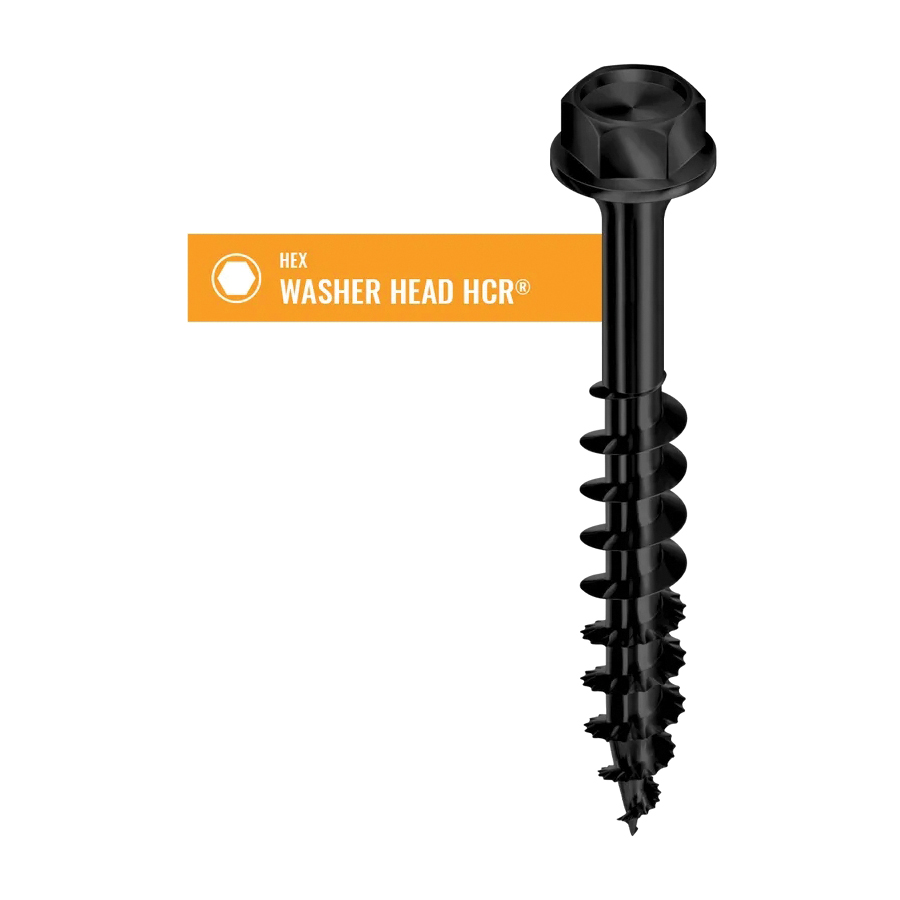 SPAX® hex washer head PowerLags® with HCR® coating are intended for wood to wood connections in exterior structural applications. These fasteners are designed with a hex head conventional driver system along with a built-in washer for applications requiring great pull-down force. Often used in high-Torque applications.