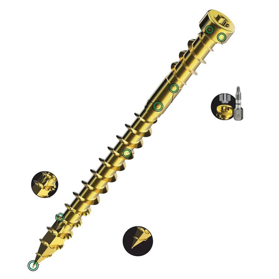 • Cylindric trim head with T-star plus drive provides great bit engagement to eliminate camming out and facilitates single hand driving plus a flush/clean finish