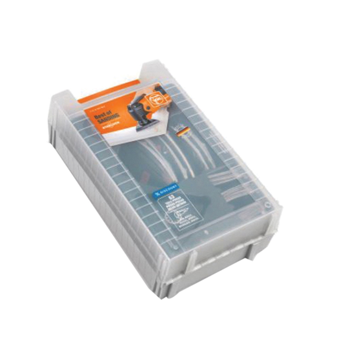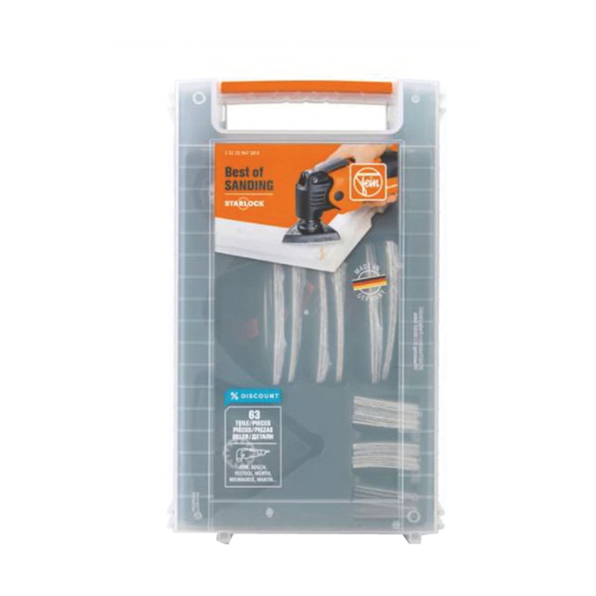 63-piece accessory set for sanding in corners and on edges. Suitable for all FEIN MultiTools and all other commercially available multi-tools with the Starlock mount. As a set, attractive savings compared to individual purchase.