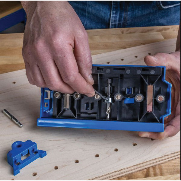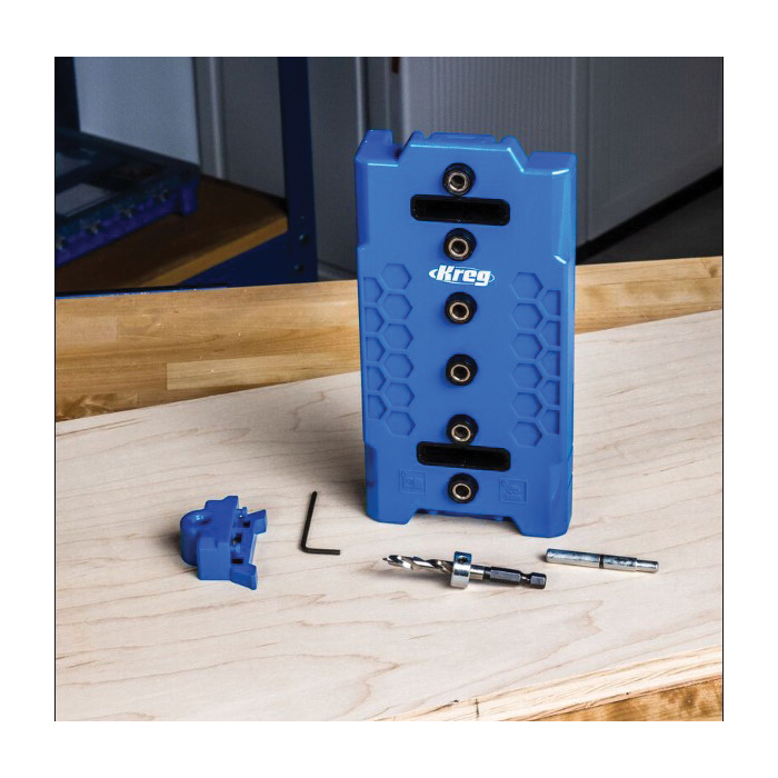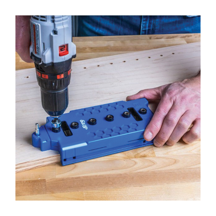 Add perfectly spaced shelf pin holes to your projects with the Kreg shelf pin jig. Hardened steel drill guides ensure precision for level, wobble-free shelves. It comes complete with a 5 mm high-quality brad-point bit. Drill guides are centered on standard 1-1/4 in (32 mm) spacing and feature a lifetime warranty. Whether you're adding shelves to existing furniture or building from scratch, creating the shelf pin holes is easy. Use the fence to align the jig with the edge of your workpiece for straight, accurate rows. Quickly drill six holes in one setup - or connect a second shelf pin jig to drill longer rows of holes with the same consistent spacing. The jig also has useful features for installing concealed cabinet hinges and drawer slides in frameless cabinets. Molded-in alignment marks and an indicator window help align mounting screws for hinge plates - set at standard backspacing for a 32 mm cabinet system - which also helps with locating the front hole for drawer slide installation.