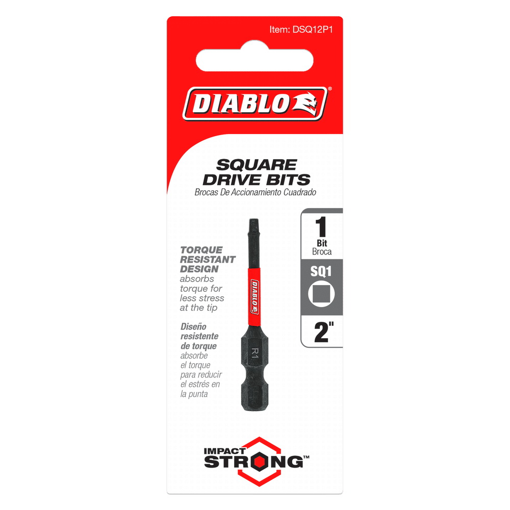 Diablo's driver bit range of square bits delivers maximum performance, extreme durability and up to 50X longer life when installing and removing fasteners. An optimized tip design provides a strong, precise grip that reduces wear, stripping and slippage. Torque-resistant design absorbs torque for less stress at the tip when tightening and removing nuts and screws. This range is Impact Strong™, delivering increased shank stability and durability in cordless and corded impact and drill drivers.