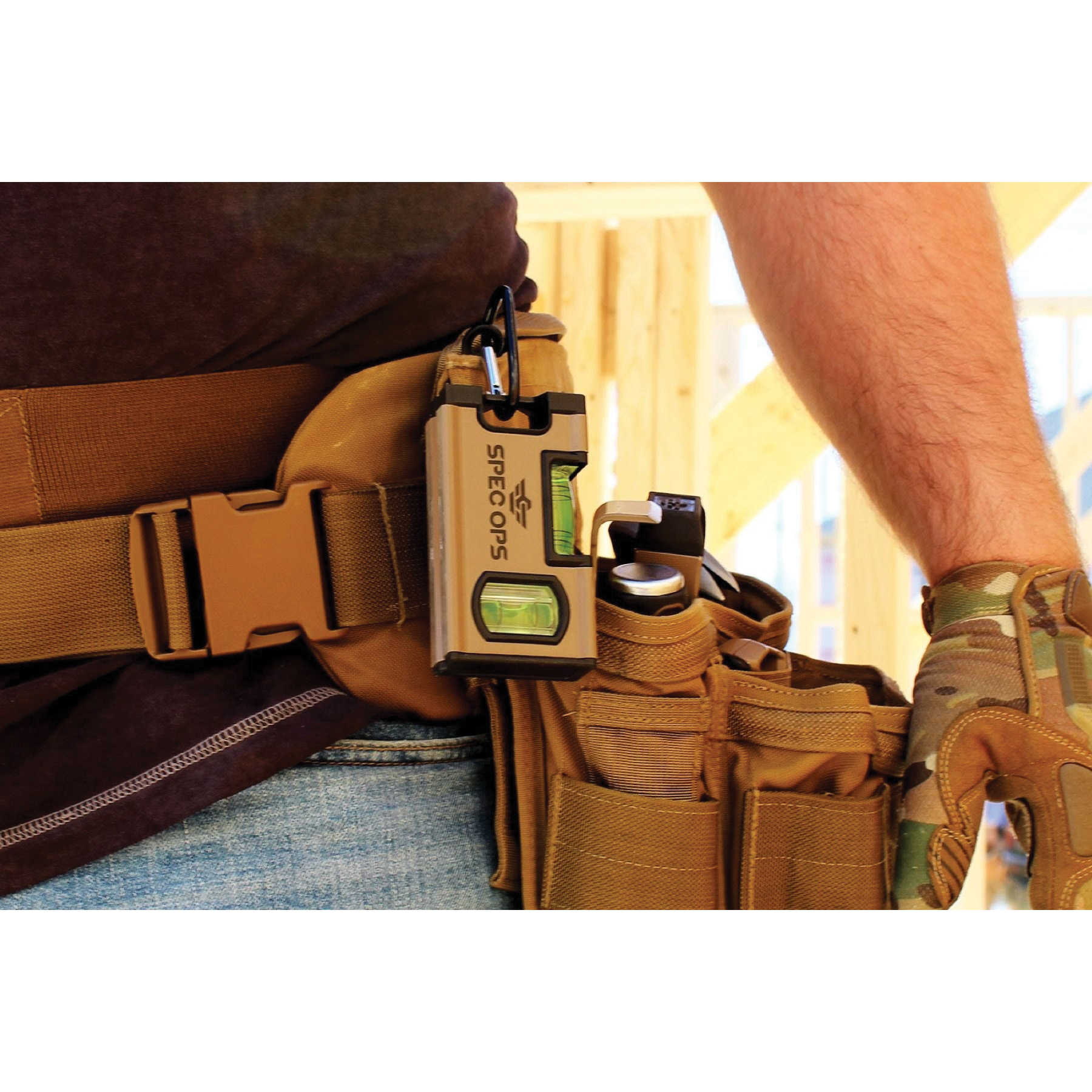 The Spec Ops tools magnetic pocket level will be your new go to level for quickly checking level or plumb surfaces. This 4 in compact pocket level will fit ideally in any pocket, tool belt pouch or anywhere else you see fit, making it a great addition to any professional's toolbox. Crafted from aluminum box beam, this level offers accuracy of 0.0005 in/in with 33% higher visibility epoxy locked block vials for elite durability. The 2% slope lines were also added to help you do more with less. The invertible vial allows for accurate reading upside down using the milled surface, while the rare earth magnets on the bottom securely grip to magnetic surfaces. A carabiner is also included for rapid deployment and easy storage. And with a assured to deliver a lifetime of mission capability on the world's toughest jobsites, this level has been drop-tested to exceed MIL-STD-810G. All Spec Ops tools are backed by our five star, hassle-free lifetime warranty and with each purchase made, we support our nation's heroes by donating 3% of proceeds to veteran and first responder causes.
