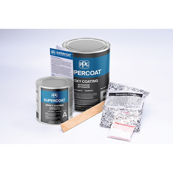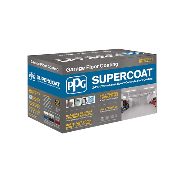 Give your garage floor a great-looking, durable coating with PPG Supercoat epoxy garage floor coating. Its patented two-part waterborne epoxy system allows moisture from the concrete to pass up through the surface, resisting blistering, peeling and other moisture pressure damage. It also typically eliminates the need for acid etching and mechanical grinding* before application, even when the surface is less than ideal. PPG SUPERCOAT Epoxy Floor Coating provides strong adhesion versus acrylic floor coating and it covers up to 250 sq-ft of floor in just one-coat.