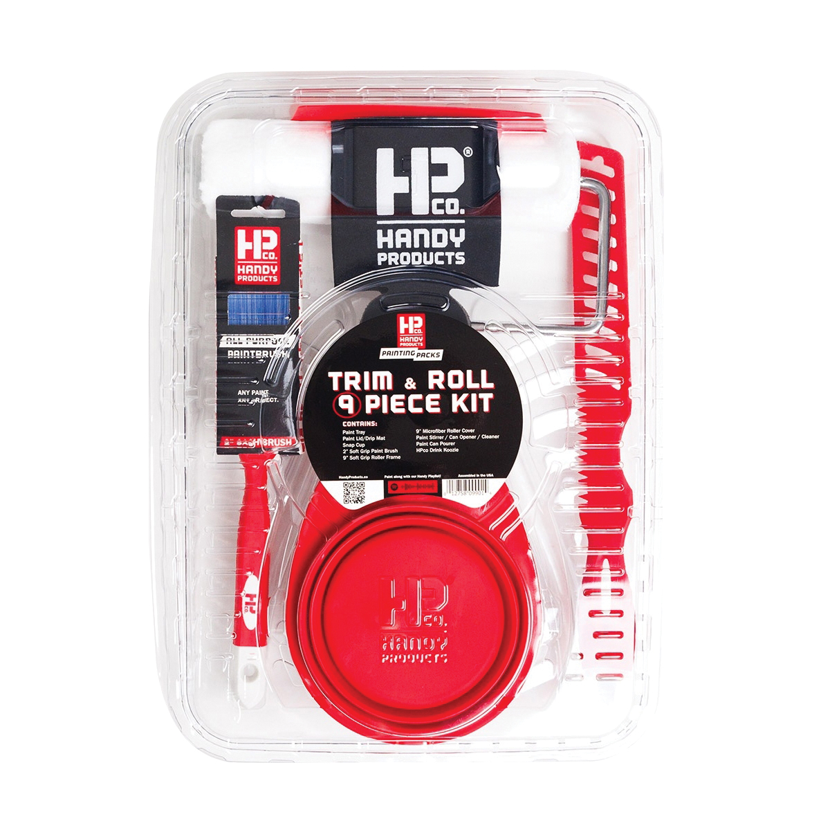 Handy Products Trim and Roll Kit, Specifications: 9 Pieces, Includes: Paint Tray, Snap Cut, 2 in Soft Grip Brush, 9 in Microfiber Roller Cover, Hp Co. Drink Koozie, Paint Tray Cover/Drip Mat, Paint Can Pourer, 9 in Soft Grip Roller Frame and Paint Stirrer/Can Opener/Cleaner