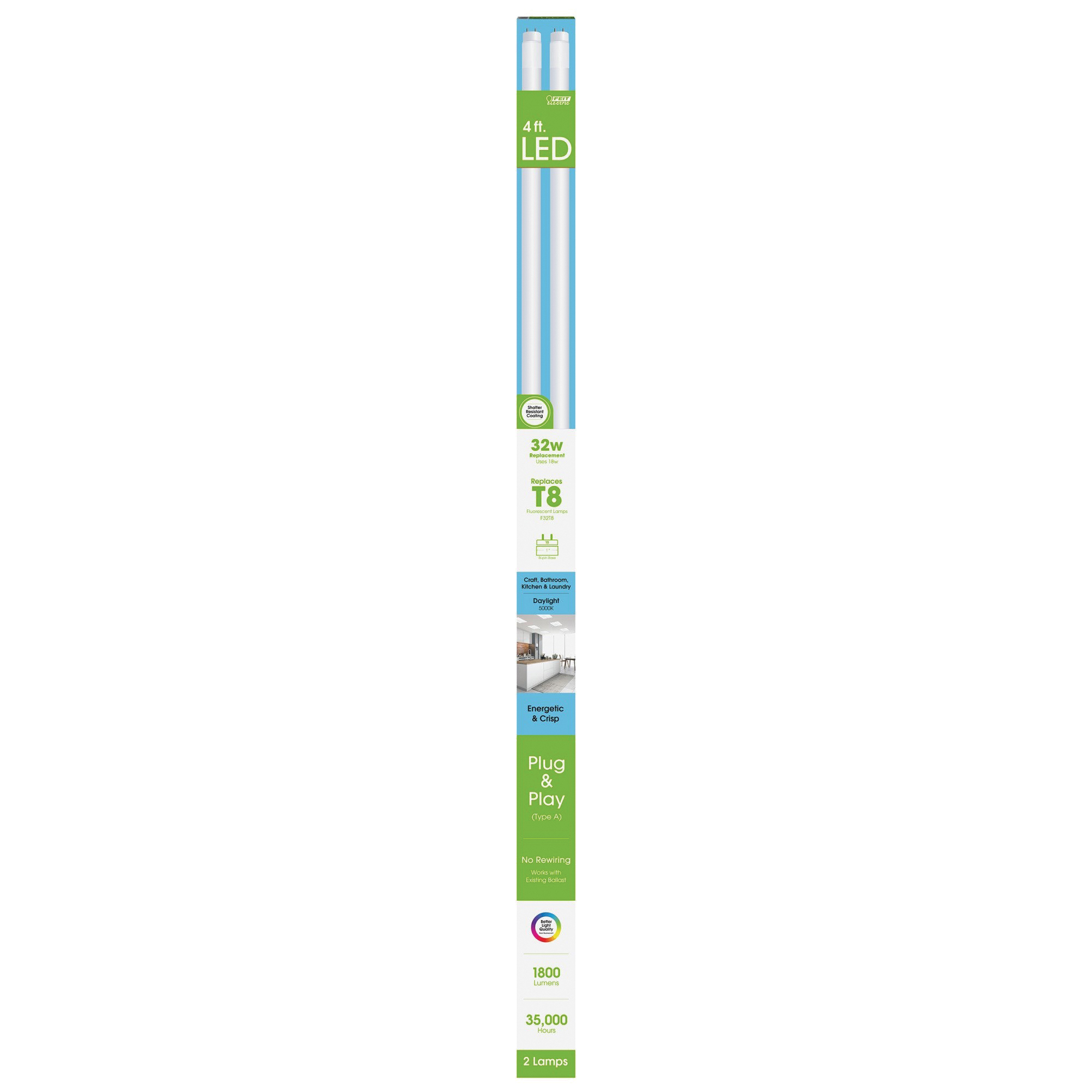 Convert your existing fluorescent fixture to LED technology with the Feit Electric T848/850/LEDG2/2 4 ft T8/T12 LED plug-and-play two-pack lamps. These 5000 K natural daylight non-dimmable tubes produce a similar fluorescent lamp output (1800 Lumens), using only 18 W of electricity - up to 44% less energy than a standard fluorescent lamp. Get instant ON to full brightness even in sub-zero temperatures with relatively cool running performance. Feit Electric shatter-proof T8/T12 lamps have an average life of 35,000 hr/32.0 years are RoHS compliant and are 100% mercury-free. Choose a dependable flicker-free bulb for residential or commercial applications. No replacement of the ballast or installation of LED driver or removal of old ballast required.