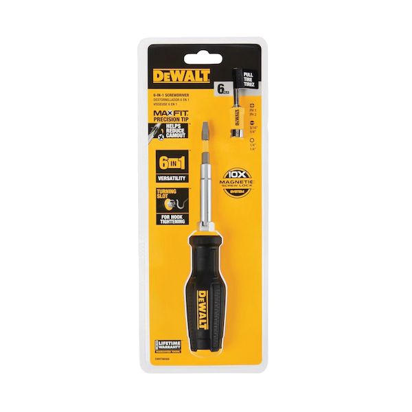 The DEWALT MAX FIT® six-way multi-bit screwdriver is designed for maximum fit in fasteners and reduces the potential for stripped screws. The six-way design allows for quick change out of bits as well as storage for your unused bits. This product also features a magnetic screw lock system, keeping fasteners secure during horizontal or vertical usage.
