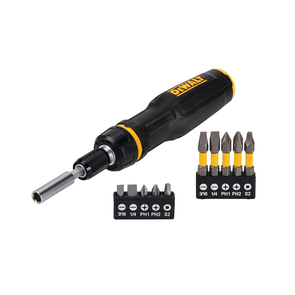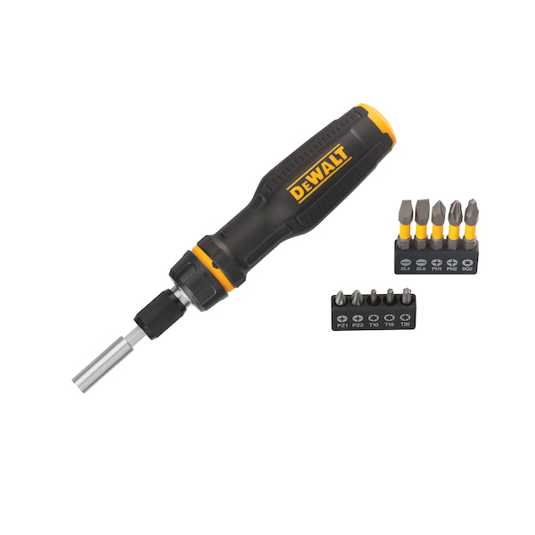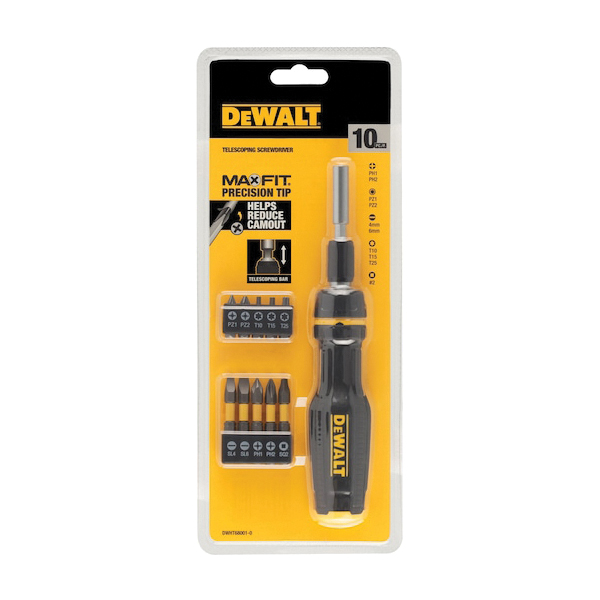 Take advantage of a consistent, near-ideal fit within fasteners using this MAX FIT® Telescoping Multi-Bit Screwdriver Set. The included Ratcheting Screwdriver was designed to optimize fastener fit for reduced slippage and stripping of screws. Its bi-material grip is engineered for less hand strain and high-torque to help you comfortably tackle multiple projects with bits stored conveniently in handle's end.