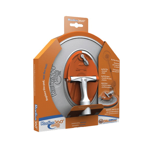 The radius 360 deg is a revolutionary drywall sanding tool, with unique side-to-side, up and down and circular mobility. The radius 360 deg features a full 9 in die, die-cast aluminum head that makes fast work of large surface areas. The round design virtually eliminates flipping and the associated surface scratching and gouging. The ability to change directions quickly without having to lift the pad off the wall is a huge advantage over the conventional method of sanding drywall. The detachable foam disc forms to the wall, providing a smooth, even finish. Unlike the conventional sand pole, this foam disc wears evenly, greatly increasing the life of the tool. Both the foam pad and the sandpaper utilize hook-and-loop backing, making for easy replacement. Loop backed sandpaper firmly attaches to the foam disc, preventing debris from collecting behind the sandpaper and eliminating a major cause of streaking. Sanding with the radius 360 deg is up to three times faster than using a conventional sand pole, with consistently great results.