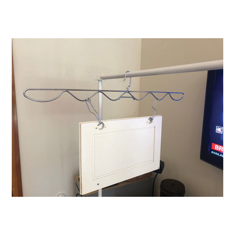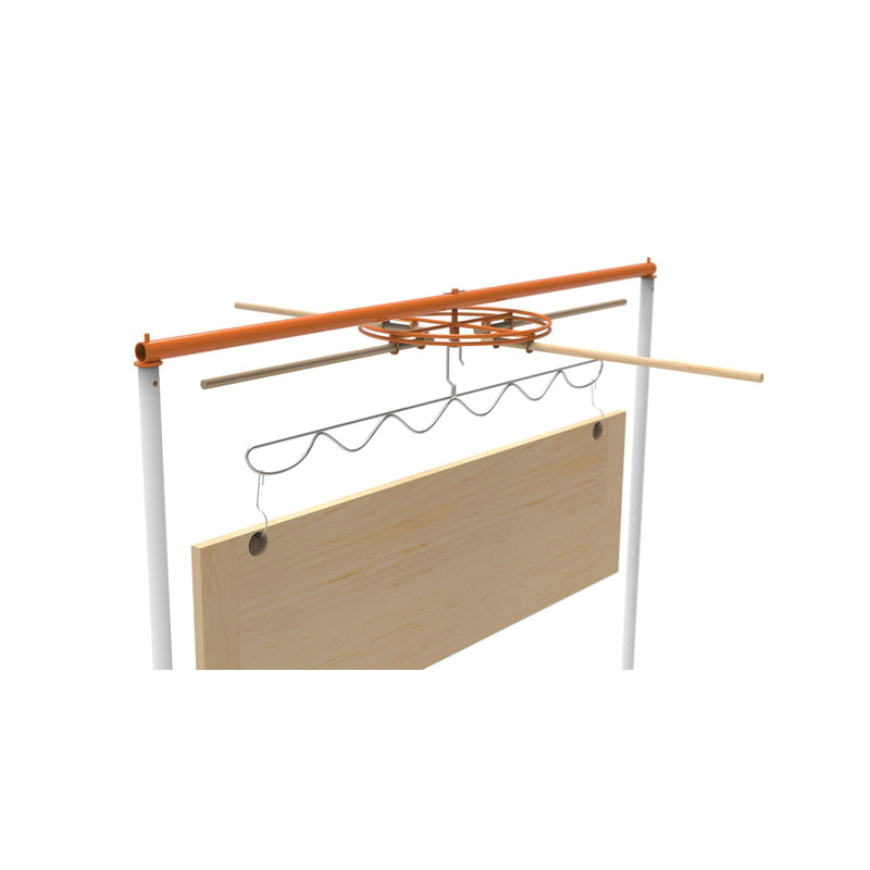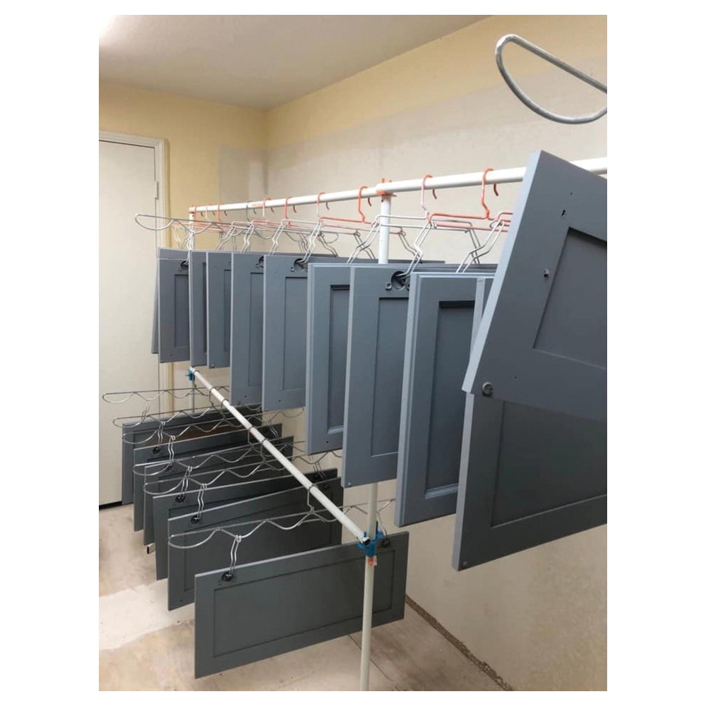 The PSDR wave hanger can accommodate cabinet doors with hinge holes up to 36 in apart. They are custom-fit to the size of the Pro Drying Rack SD Series poles for minimum swing, allowing you to hang cabinet doors and parts closer together. The PSDR's 18 ft of drying line is enough space for drying up to 50 cabinet doors. The PSDR Series with hinge hooks or EFC hooks provides ideal and completely unmarred surface results. Hinges hooks are placed in the cup holes and then fit over one of Paint Line's hangers for all-sides spraying and drying. Cup-hooks can also be screwed into the tops and bottoms of cabinet doors to be hung and sprayed. After painting on the spinner assembly, the door on the hanger is simply transferred over to the drying line where it will hang until ready for door hardware and installation.