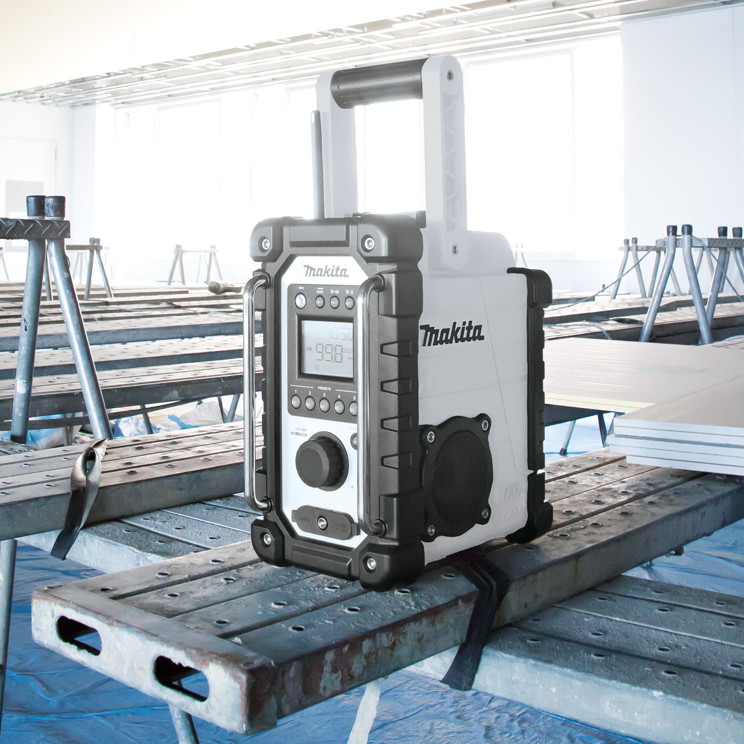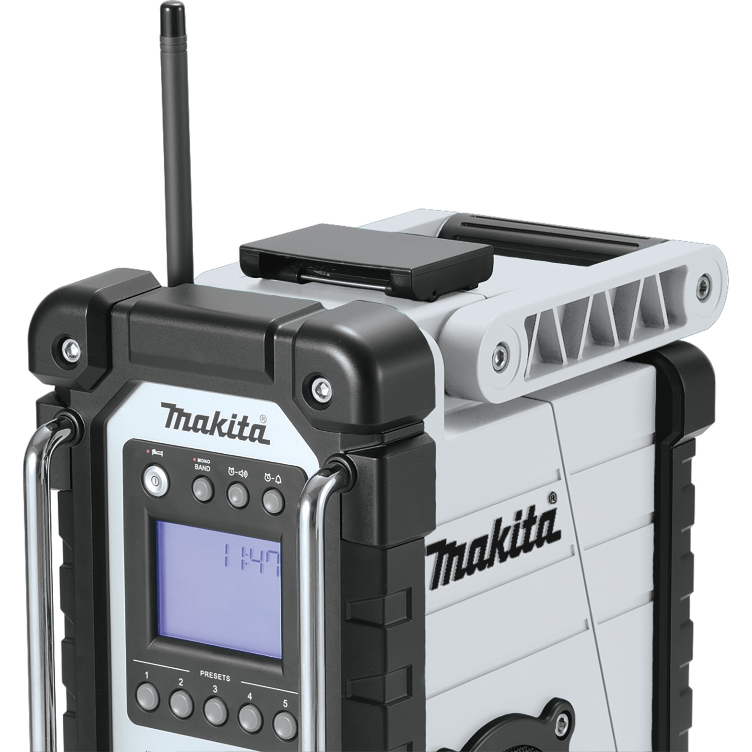 The 18 V LXT® lithium-ion job site radio (model XRM05W) delivers rich sound and increased compatibility in a more compact size. It is a perfect addition to the workshop or job site. It's part of Makita's expanding 18 V lithium-ion system, the world's largest cordless tool system powered by 18 V lithium-ion slide-style batteries. Makita 18 V lithium-ion batteries have the fastest charge times in their categories, so they spend more time working and less time sitting on the charger. The XRM05W is MP3 compatible for iPod® and MP3 players and delivers rich stereo sound from two powerful 3 in side-firing speakers. It is engineered to stand up against harsh job site conditions with protective bumpers and features dust and water resistant construction for increased durability.