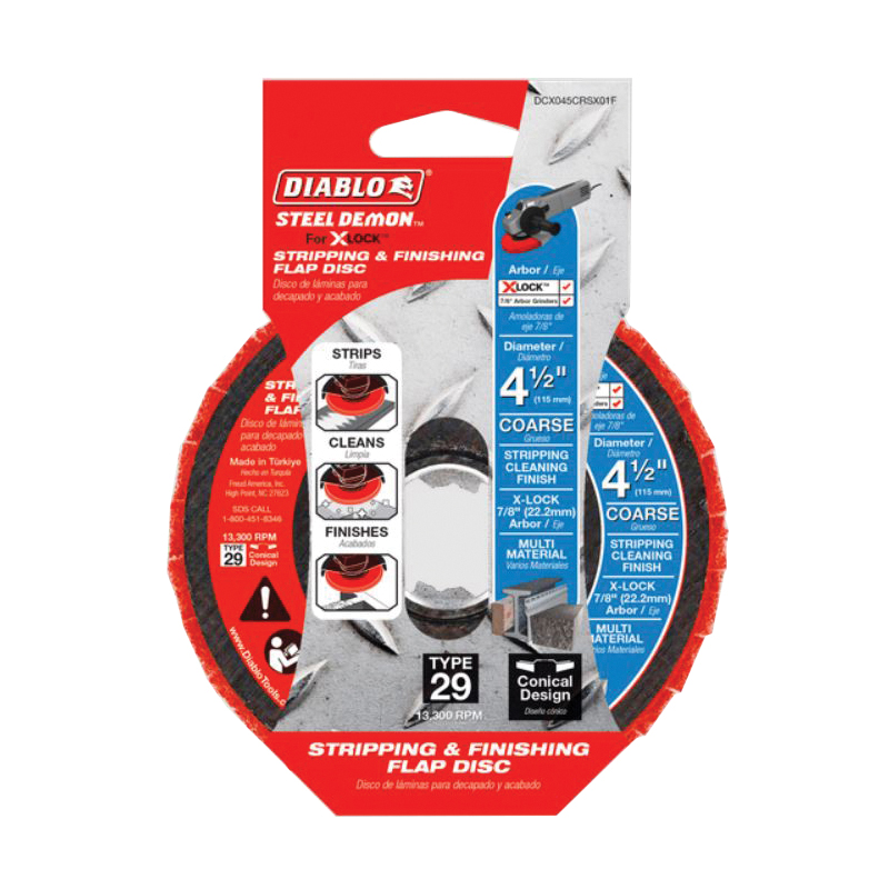 Diablo's Steel Demon™ stripping and finishing flap discs strip, clean and finish simultaneously to help you scale down and smooth out surfaces. Featuring X-LOCK™, these flap discs can be changed quickly, without the use of tools. A conical shape and premium grit composition combine for faster material removal, leaving behind a shiny surface that gives your work piece a revitalized appearance and/or operational resurgence. Designed to be backwards compatible, these discs work with X-LOCK™ angle grinders and 7/8 in arbor angle grinders.