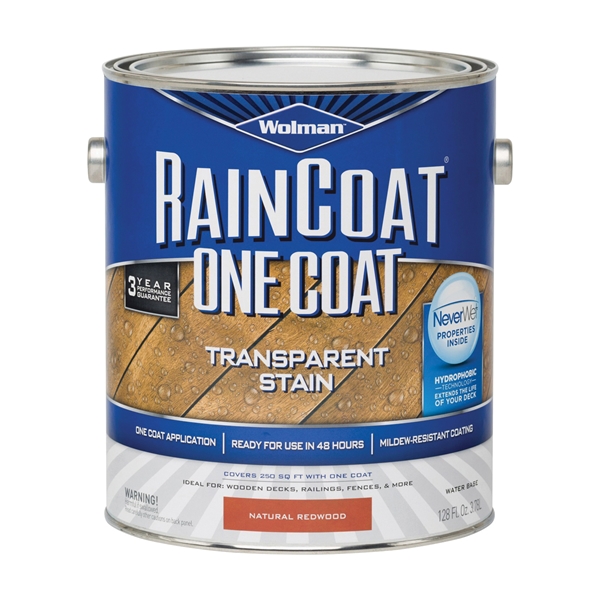 Wolman RainCoat® one-coat transparent stain is a one-coat, water-based exterior water repellant designed to provide protection against water damage, UV graying and mildew. RainCoat® one-coat transparent stain formula beautifies wood with sheer natural woodtoned color, which allows the wood's character to show through while protecting the surface from water damage. The NeverWet® hydrophobic technology with excellent water repellency helps maximize resistance to wood cracking, checking, splitting and warping. It is easy-to-use, dries fast and cleans up quickly with water. RainCoat® one-coat transparent stain is suitable for use on all types of pressure treated lumber, cedar, redwood, poplar, hickory and other North American hardwoods. Use RainCoat® one-coat transparent stain to beautify and protect decks, porches, fences, shake, shingle and clapboard siding, boat decks, boardwalks, outdoor furniture, gazebos, arbors and trellises, storage sheds and more.