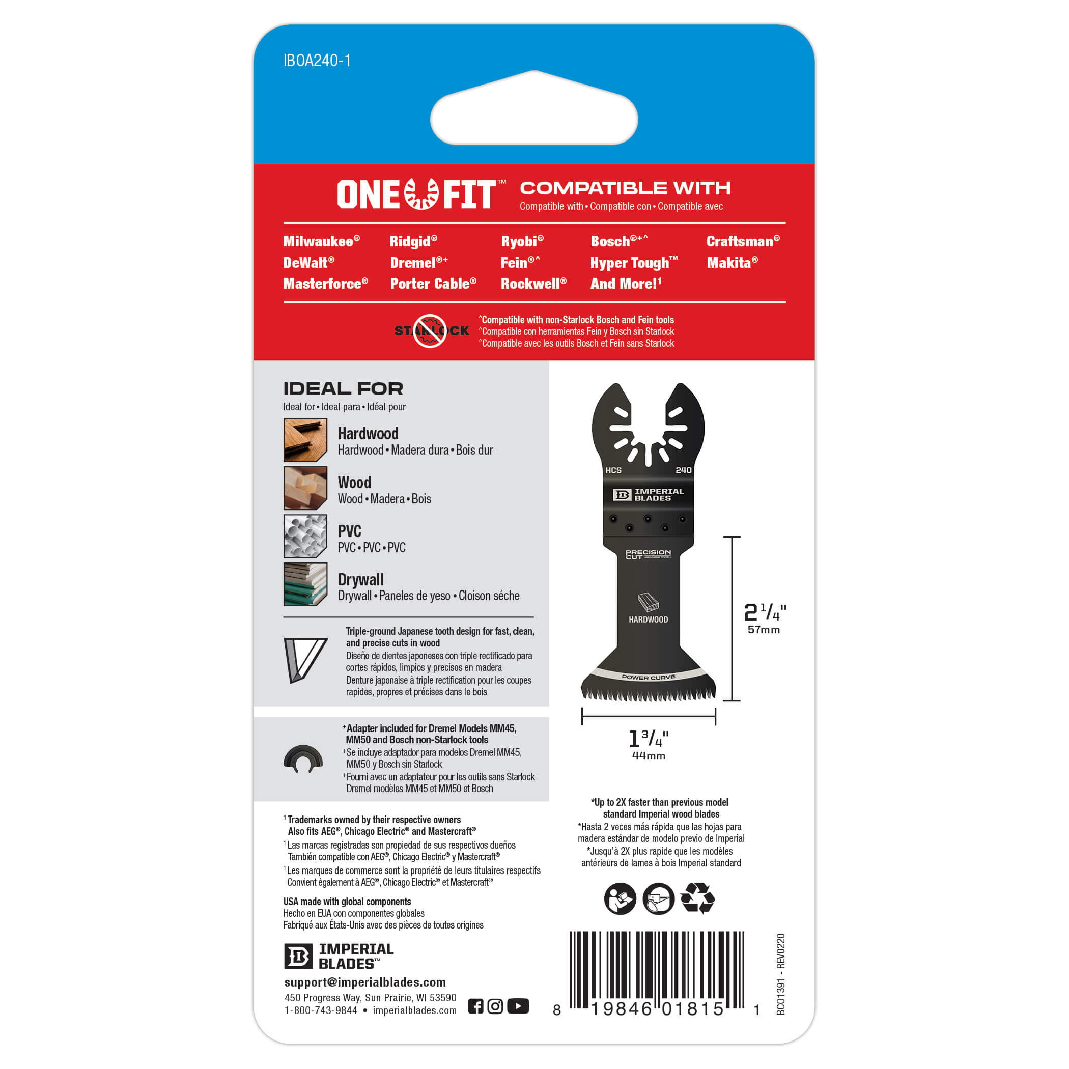 Imperial Blades ONE FIT Power Curve Blade, Size: 1-3/4 in, Tooth Type: Japanese, High Carbon Steel, Applicable Materials: Hardwood, Wood, PVC and Drywall, Black, 4-1/4 in Length, 1-3/4 in Width, 0.027 in Thickness, Suitable for: Black & Decker, Chicago Electric, Craftsman, DeWalt, Dremel, Metabo, Genesis, Hitachi, Makita, Masterforce, Milwaukee, Performax, Porter Cable, Ridgid, Rockwell, Ryobi, Worx, Tool Shop, Fein Multi-Master (to 3/2016), Kobalt, AEG, Hyper Tough and Mastercraft Tools