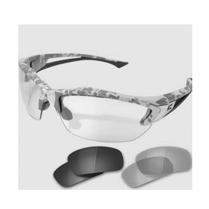 Edge Khor Safety Glasses Kit, Gender: Unisex, Lens Coating: Anti-Fog, Scratch-Resistant, Lens Material: Polycarbonate, Frame Type: Wraparound, Frame Material: Nylon, Frame Color: Digital Camouflage, Temple Type: Soft, Temple Material: TPR, UV Protection: 99.9 %, Includes: Anti-Reflective, Digital Camouflage Frame, Hard Case, Lens Cleaning Bag, Polarized Smoke, Yellow Interchangeable Lenses
